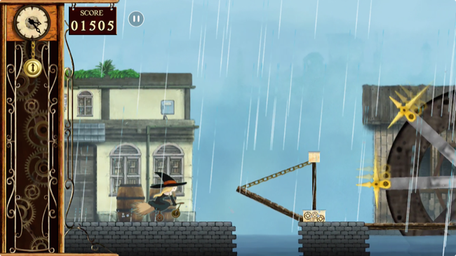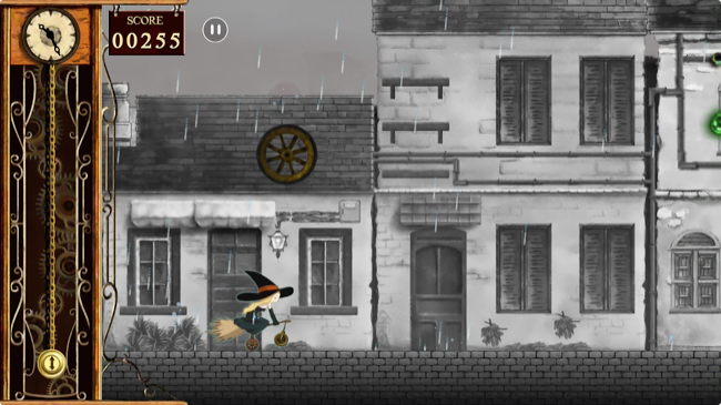 魔女は時の流れの変化に関係なく同じスピードで進み続けます。そのため、襲いかかる障害物が空中でゆっくりと動いている間にゆうゆうとその下を通り抜けられるわけです。