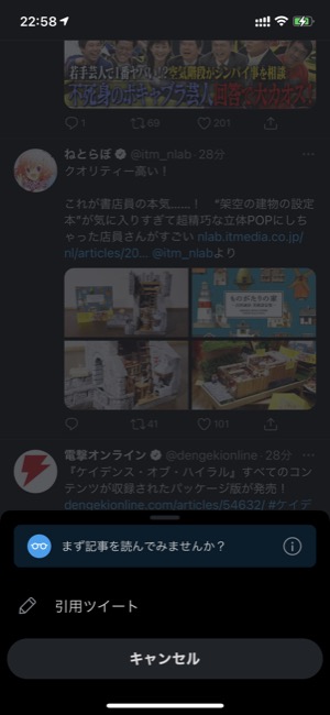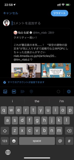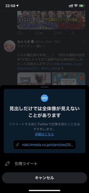 ただしあくまで警告なので、画面下部にある「引用リツイート」をタップすると、その名の通り引用リツイート画面となり、投稿することもできます。
