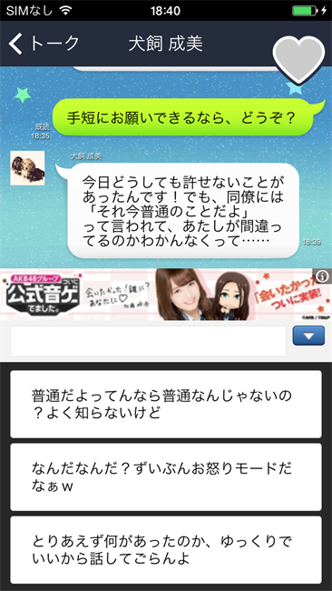 「俺こんなに女の子からL○NE来たの初めてだー」となっても仕方ないくらいモテモテになれる魅惑のアプリ。しかも文章を考えるのが苦手な人でも問題なし!3つの選択肢の中から選んで送れる非リア充には嬉しい親切設計。